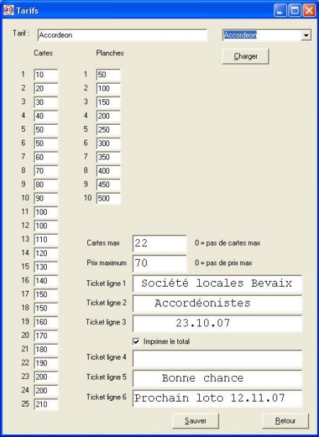 | 2) De créer un fichier tarifaire pour chaque loto avec le prix des cartes, des planches ainsi que le prix et le nombre de cartes maximum. |